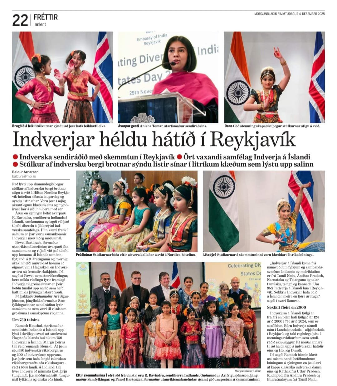 An article by Mr. Baldur Arnarson titled “Indians hold a festival in Reykjavik” was published in the Icelandic newspaper Morgunblaðið on 4 December.