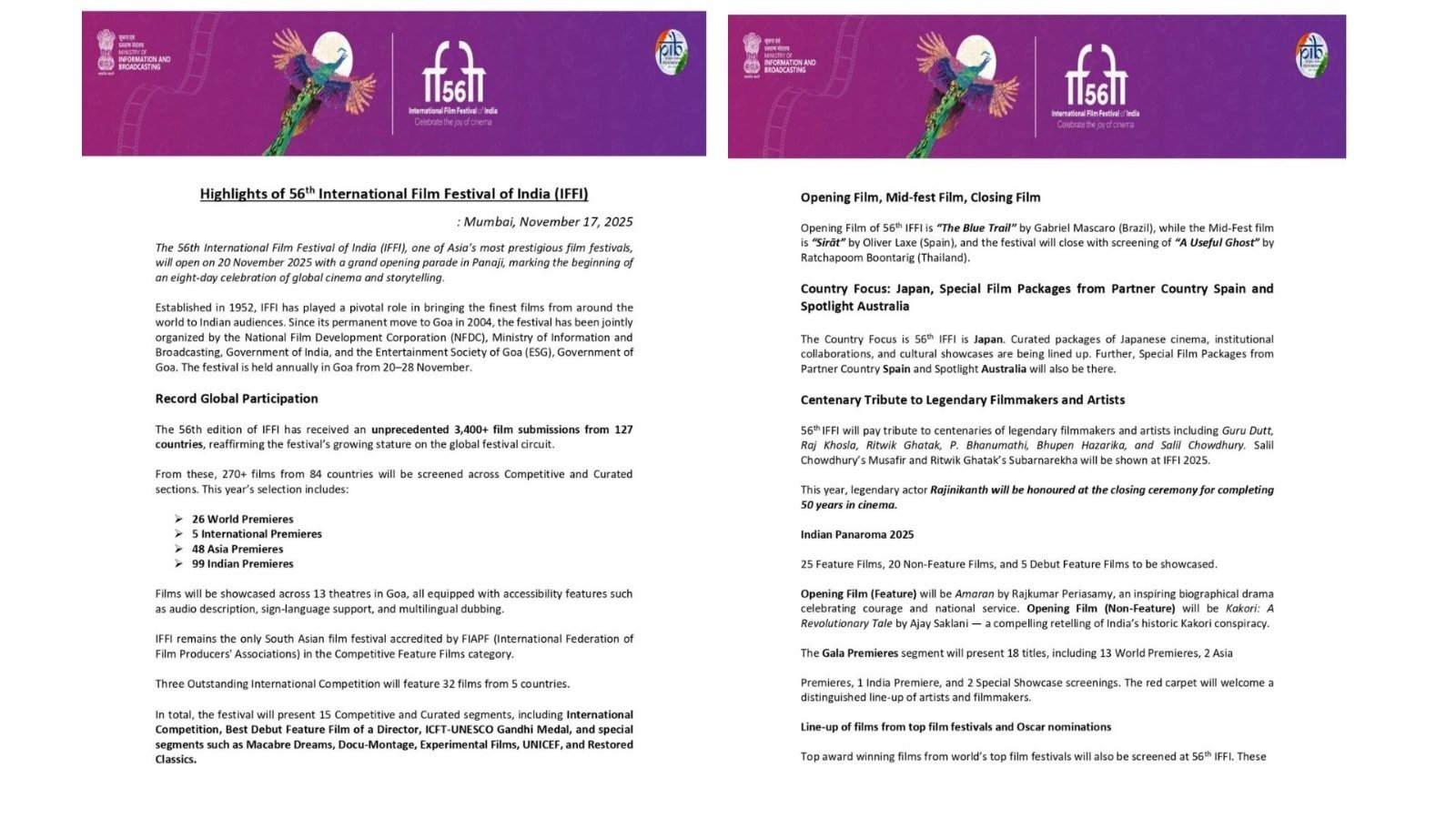 The 56th International Film Festival of India is all set to begin in Panaji, Goa from 20–28 November 2025!