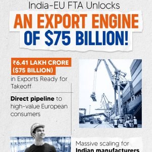 By fostering closer economic collaboration, the India–EU FTA paves the way for deeper bilateral investments, industrial partnerships, and technology cooperation—benefiting industries such as pharmaceuticals, clean energy, digital technologies, automotive, and more.