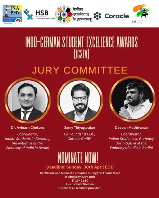 ![May be a graphic of 3 people and text that says "ISA BHV IndianStudens' Bremerhaven HSB Indian इपवेडराई ਨਨ gerलany Coracle ISABI INDO-GERMAN STUDENT EXCELLENCE AWARDS (IGSEA] JURY COMMITTEE Samy Thiyagarajan Dr.Avinash Chekuru Coordinator, Indian Students in Germany (An initiative of the Embassy of India Berlin) Co-Founder coo, Coracle GmBH Deeban Mathivanan Coordinator, Indian Students in Germany (An initiative the Embassy of India in Berlin) NOMINATE NOW! Deadline: Sunday 30th April EOD Certificate and Memento provided during the Annual Meet Wednesday, May 10th 17:15 21:30 Hochschule Bremen (Open for provided)"](https://scontent.fmyq2-1.fna.fbcdn.net/v/t39.30808-6/343779998_5379566138813440_6314854653813072269_n.jpg?stp=dst-jpg_s640x640&_nc_cat=104&ccb=1-7&_nc_sid=730e14&_nc_ohc=QnNvsmxl8FgAX_uplX8&_nc_ht=scontent.fmyq2-1.fna&oh=00_AfCD3E_VRcpZkx9IVfKLFeeWgWi3oYs-be0XBteNawYxWA&oe=645AA3E8)