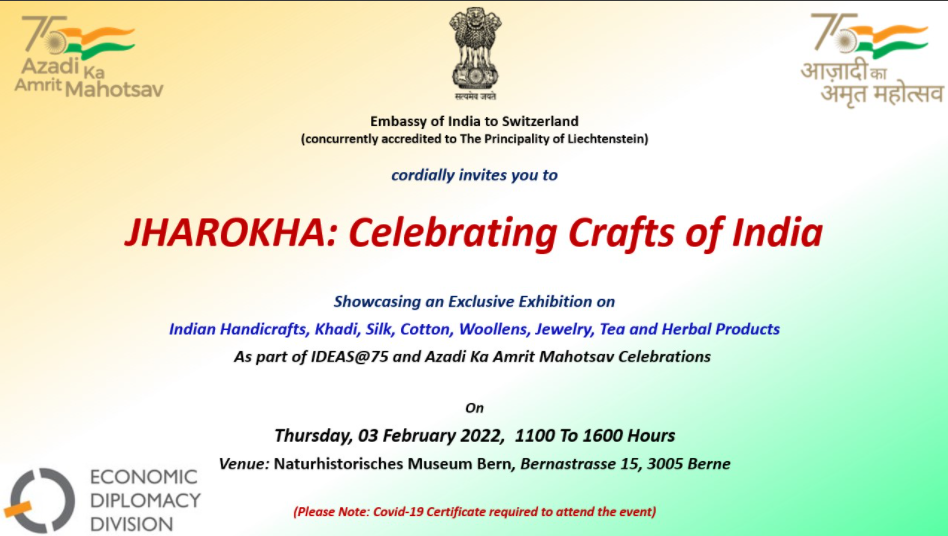 cordially invites you to an Exhibition “Jharokha: Celebrating Crafts of India” on 3.2.2022 from 1100 to 1600 hours at Naturhistorisches Museum in Berne. Refer flyer for details.