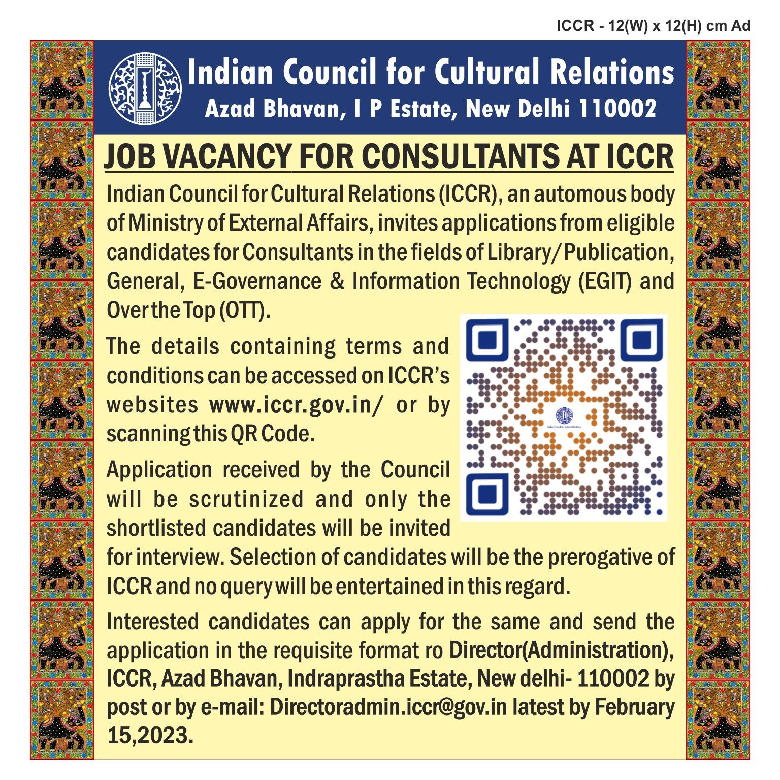 ICCR is seeking Consultants to assist the E-governance and Information Technology, General ,OTT & Library/Publication.