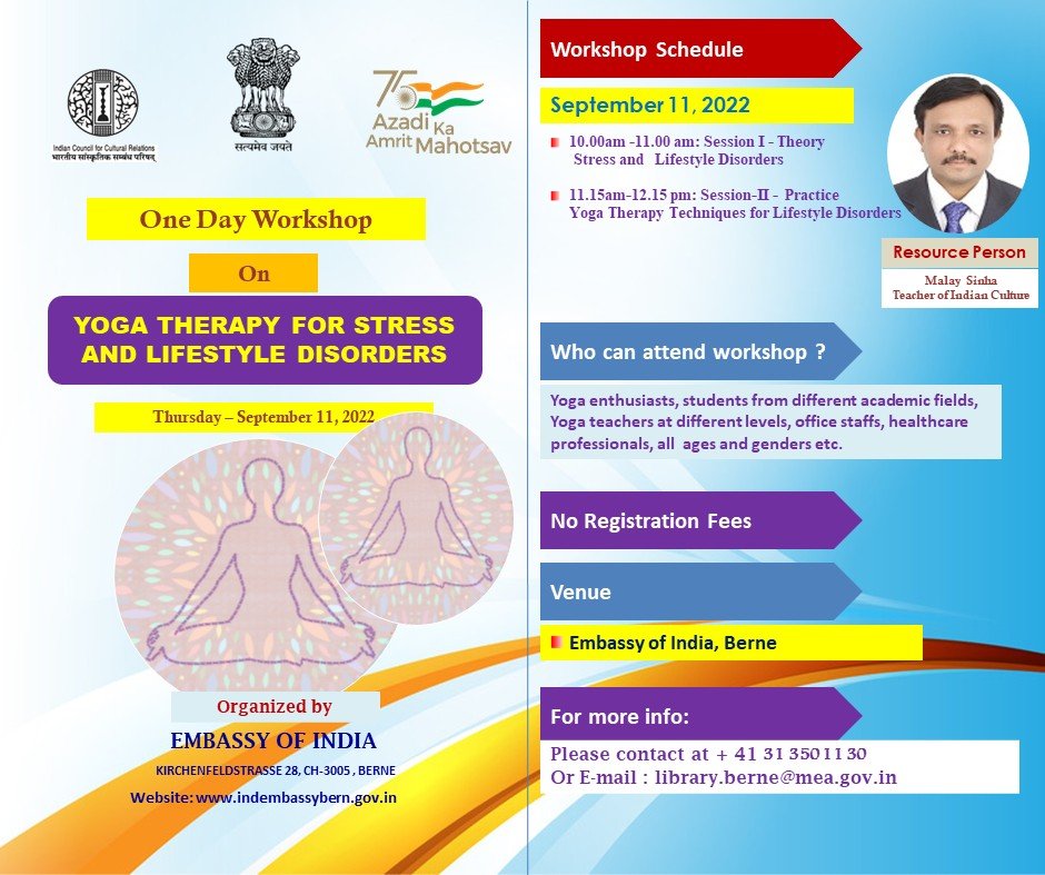 Join the one day Workshop on ‘Yoga Therapy for Stress and Lifestyle Disorders’ being organized by Embassy of India, Berne on 11 September, 2022.
