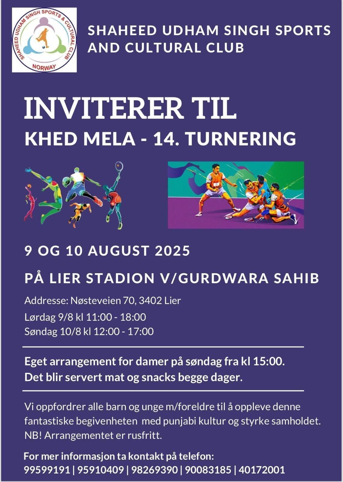 INVITES YOU TO KHED MELA – 14th TOURNAMENT 9th and 10th August 2025. At Lier Stadium by Gurdwara Sahib