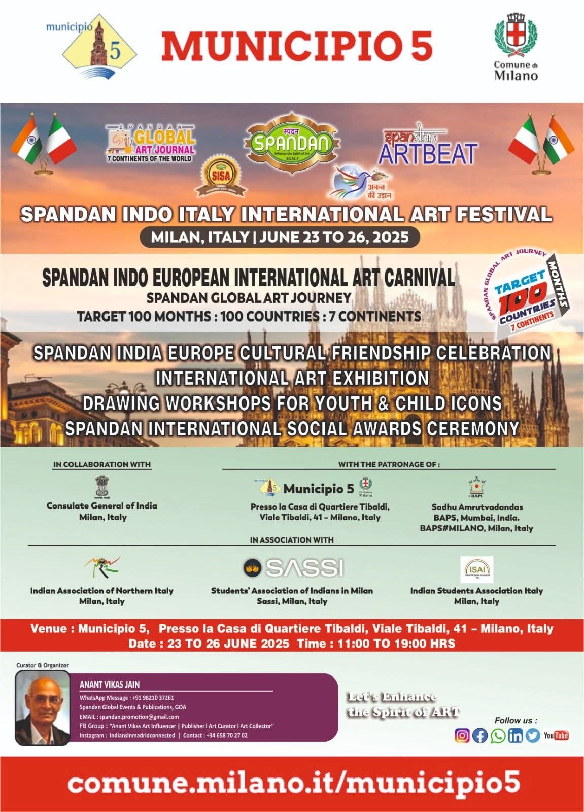 The Consulate General of India in Milan, in collaboration with the Indian Association of Northern Italy, Students’ Association of Indians in Milan (SASSI), and Indian Students Association Italy (ISAI), cordially invites you to the Spandan Indo-Italy International Art Festival, under the esteemed patronage of Municipio 5 – Comune di Milano and Sadhu Amrutvadas – BAPS, Mumbai/Milan.