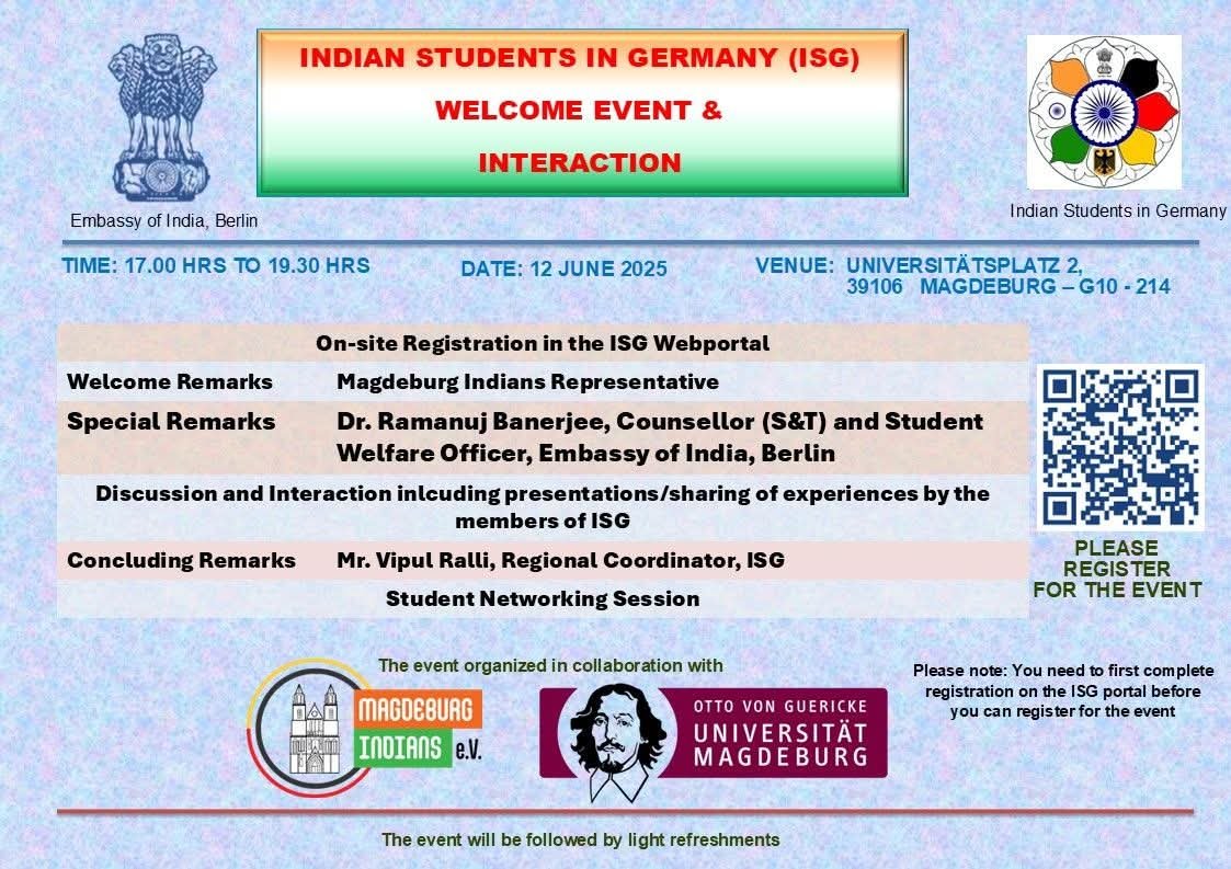 The Embassy of India, Berlin, in collaboration with Magdeburg Indians e.V. and Otto von Guericke University Magdeburg, is pleased to invite Indian students to a Welcome and Interaction Event organized under the banner of Indian Students in Germany (ISG).