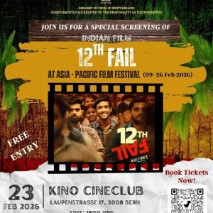 Celebrating Indian Cinema at the Asia-Pacific Film Festival in Bern Celebrating Indian Cinema in Bern 🇮🇳 India in Switzerland & Liechtenstein is delighted to participate in the 2nd Asia-Pacific Film Festival (9–26 Feb 2026) in Bern! You are warmly invited to a special screening of the inspiring Indian film: 🎥 12th Fail 📅 23 February 2026 📍 Kino Cineclub, Laupenstrasse 17, 3008 Bern 🎟️ Book your seats now: https://quinnie.ch/eventdetails/?eventID=176137 SOURCE OF LINK; https://www.facebook.com/photo?fbid=1323267983171662&set=a.287380163427121