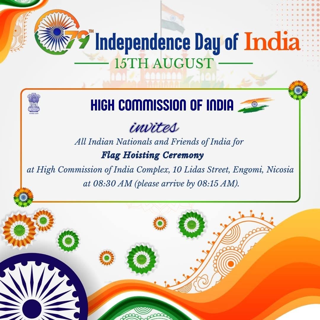 High Commissioner Mr. Manish and the team at the High Commission of India, Nicosia, warmly invite all Indian nationals and friends of India to come together and mark this proud occasion. Let us honour the spirit of freedom and unity.