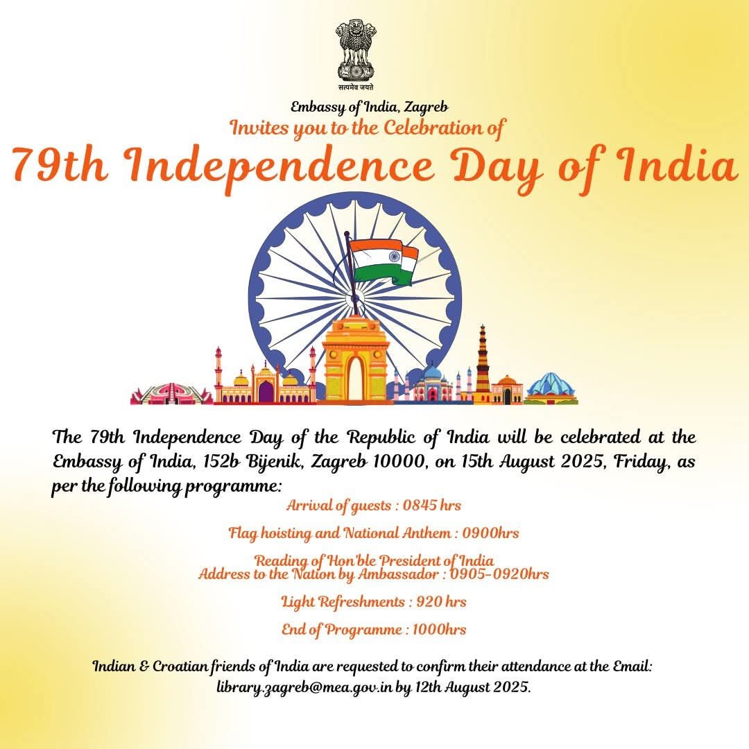 ๐ง RSVP: Indian nationals and friends of India in Croatia are kindly requested to confirm their participation by 12 August 2025 at library.zagreb@mea.gov.in.