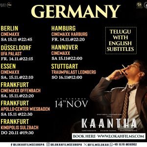 This high-octane film delves into the world of fame, ambition, and obsession, packed with unexpected twists and powerful performances. Don’t miss the cinematic excitement as Kaantha hits theatres across Germany from 14 November