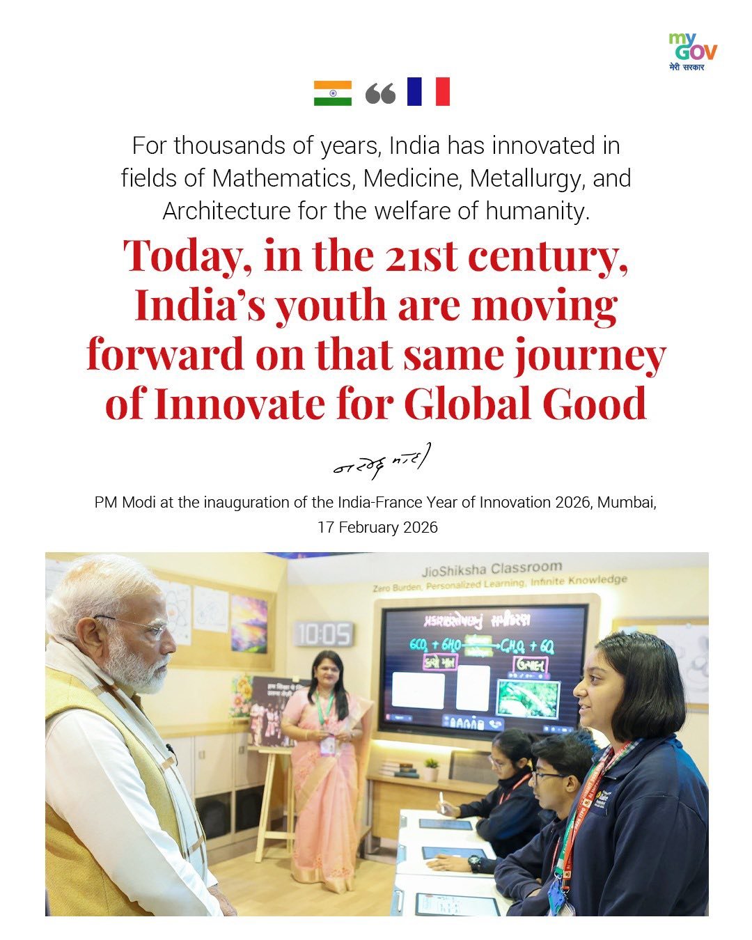 The Prime Minister emphasised the growing momentum in the innovation partnership between India and France, highlighting technology, startups, research, and clean energy as key pillars of future collaboration.