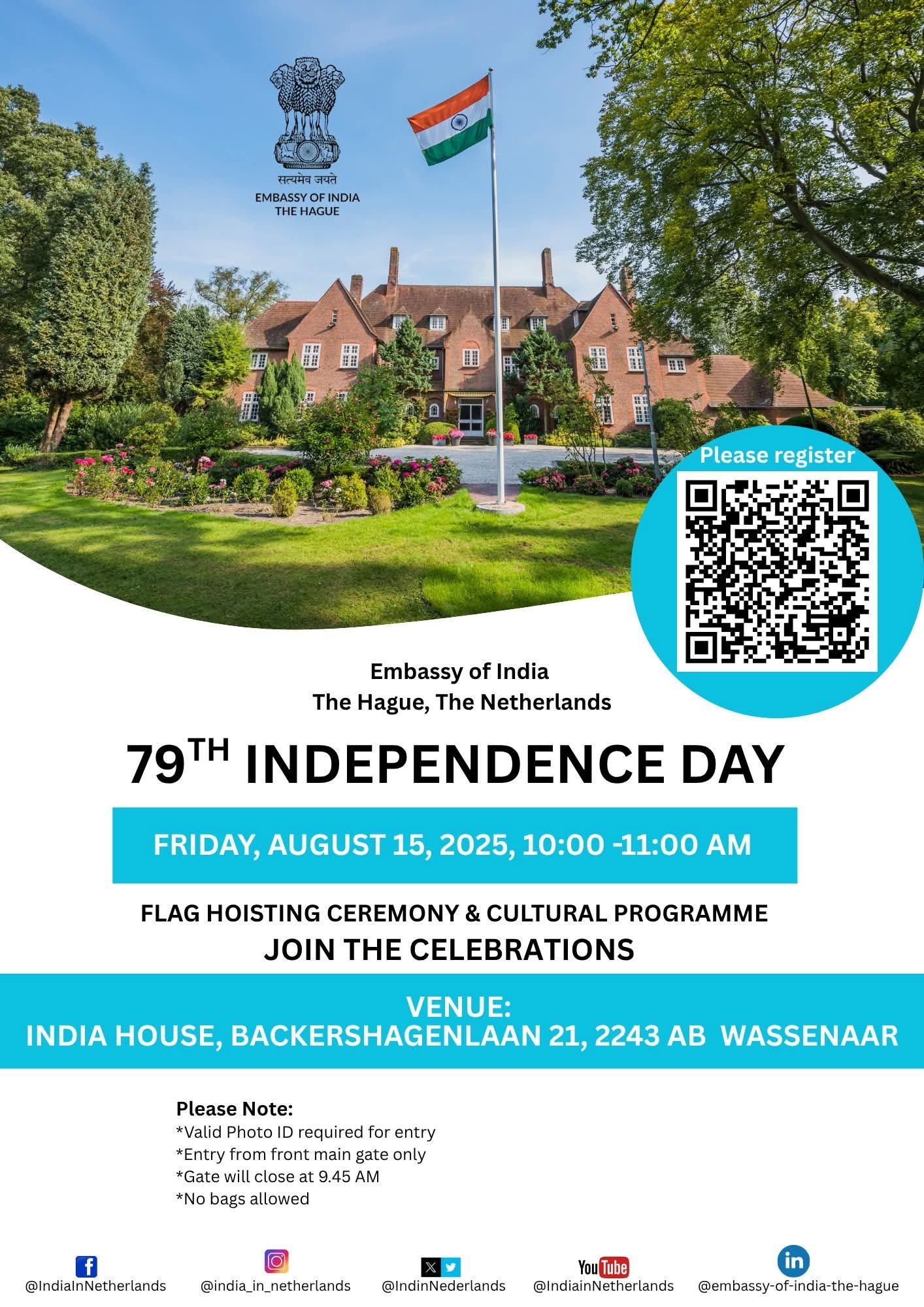 The Embassy of India, The Hague warmly invites you to join the celebrations of India’s 79th Independence Day on Friday, August 15, 2025, from 10:00 AM to 11:00 AM at India House, Wassenaar.
