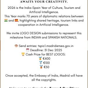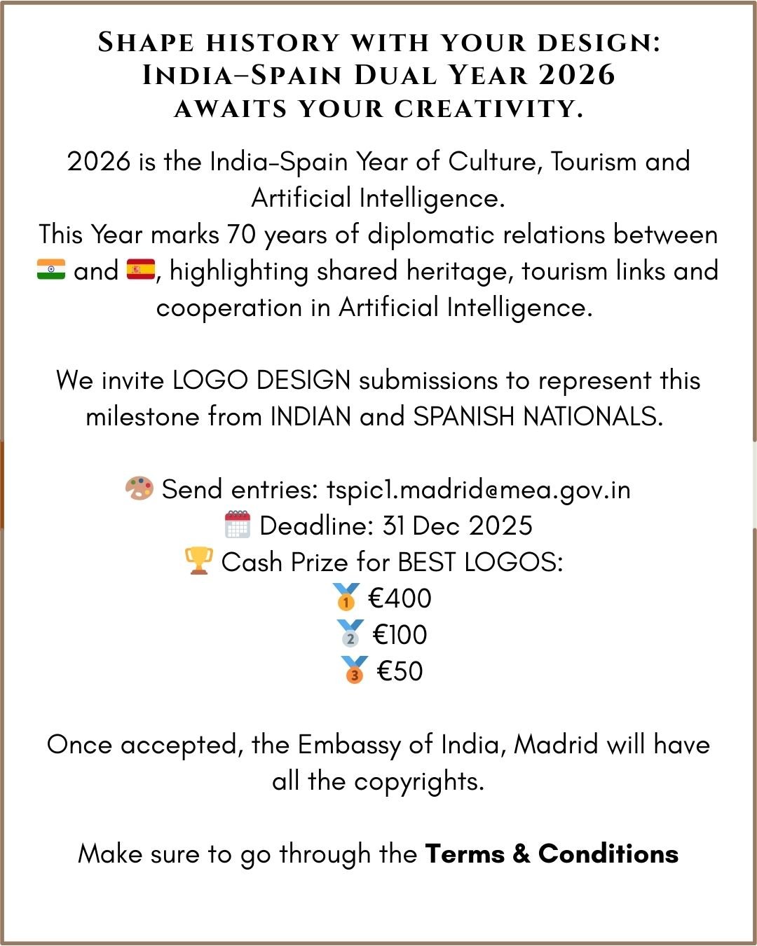 2026 marks 70 years of diplomatic relations between India and Spain, celebrating shared culture, tourism, and collaboration in Artificial Intelligence. To honour this milestone, we are inviting Indian and Spanish citizens to design the official logo for this landmark year!
