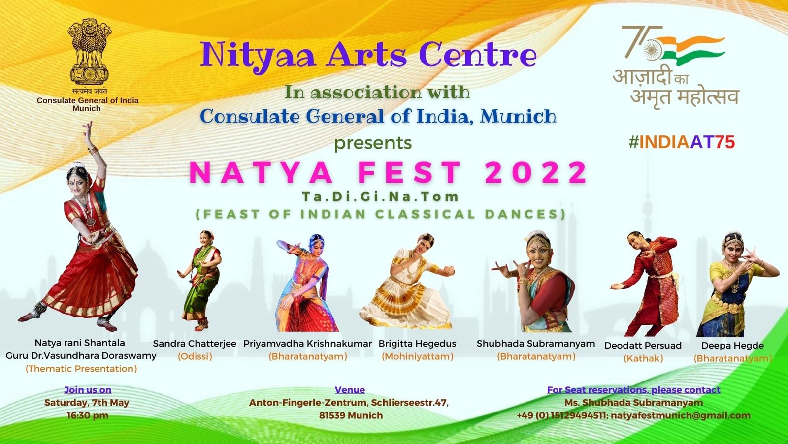 Nityaa Art Centre in association with CGI Munich is organizing Natya Fest 2022 (Feast of Indian Classical Dances) under Azadi Ka Amrit Mahotsav on Saturday 7th May 2022 at Anton-Fingerle-Zentrum, Munich.