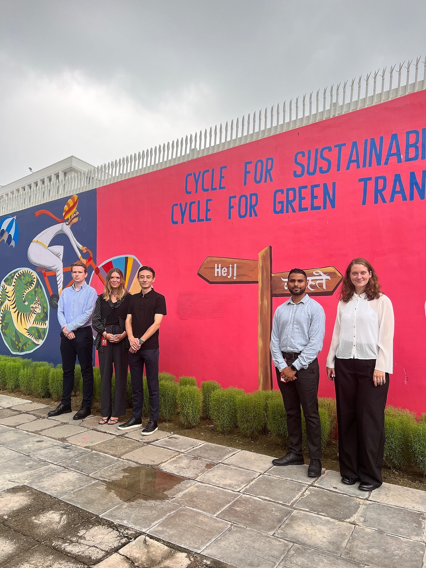May be an image of 4 people, people standing, outdoors and text that says "SUSTAINAB! CYCLE FOR FOR GREEN TRAN CYCLE Hej! лили 1ብ/ 不地 E"