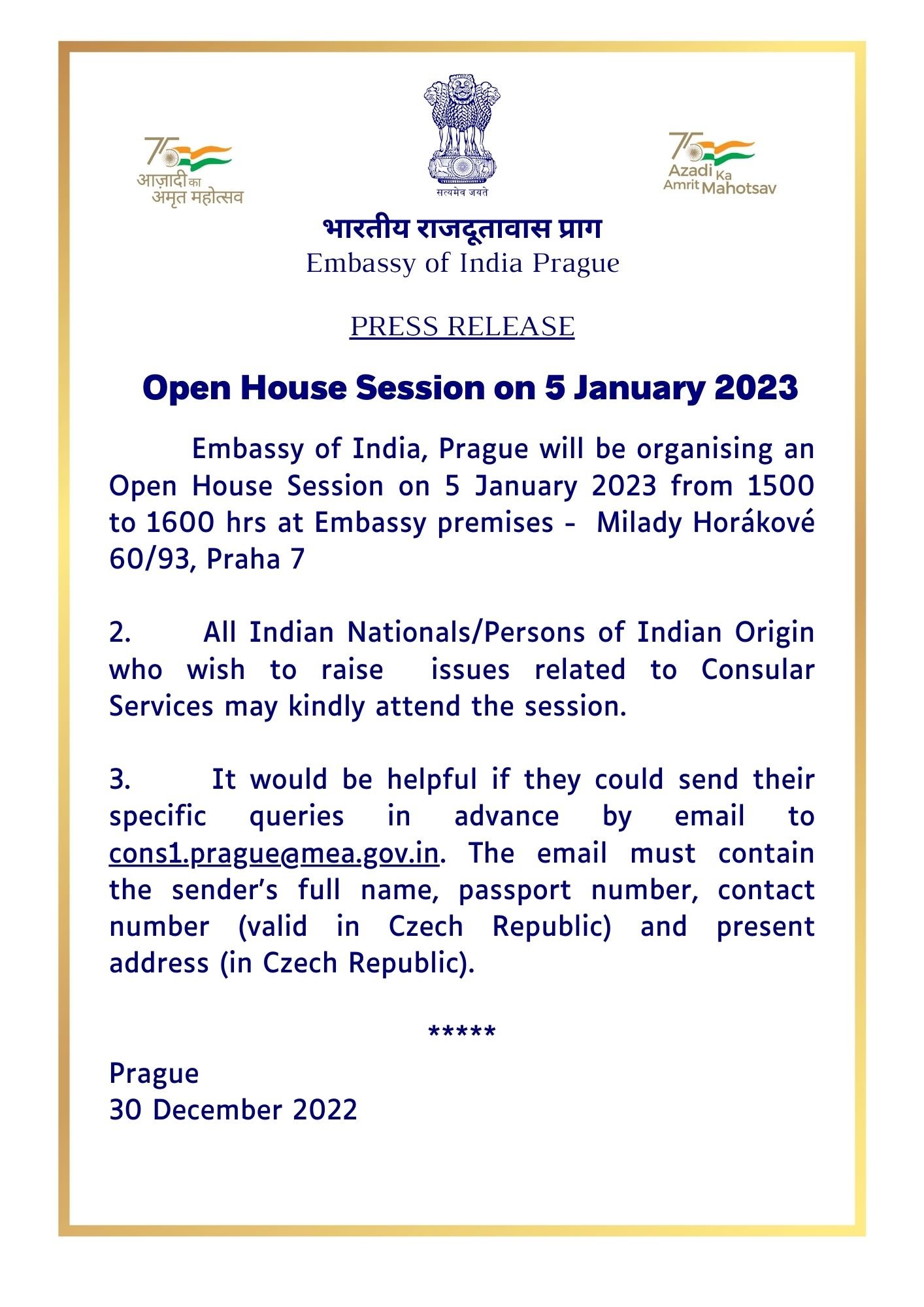 Open House session on 05 January 2023 at India In Czech Republic Embassy of India Prague