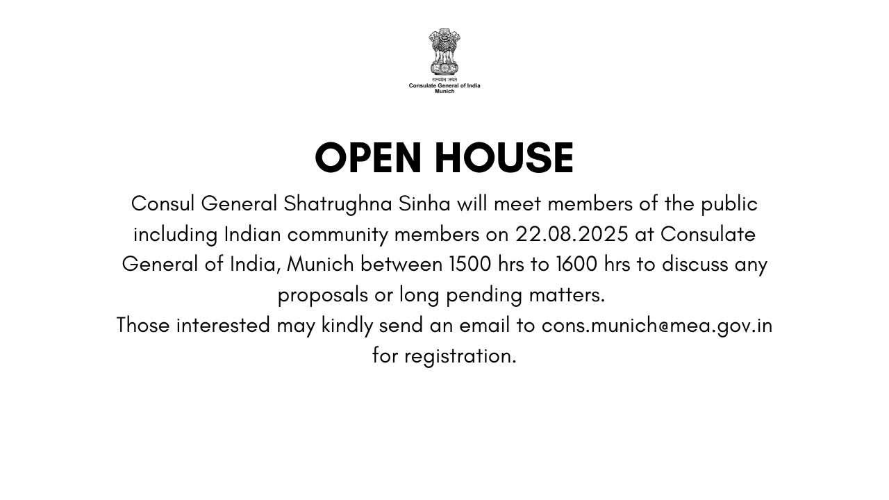 The Consulate General of India, Munich, is pleased to announce an Open House Session with Consul General Shatrughna Sinha on 22 August 2025 (Friday) from 1500 hrs to 1600 hrs at the Consulate premises.