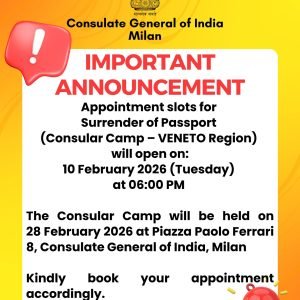 The Consulate General of India, Milan will be organizing a Consular Camp to provide Passport Surrender services for the Indian community residing in the Veneto Region.