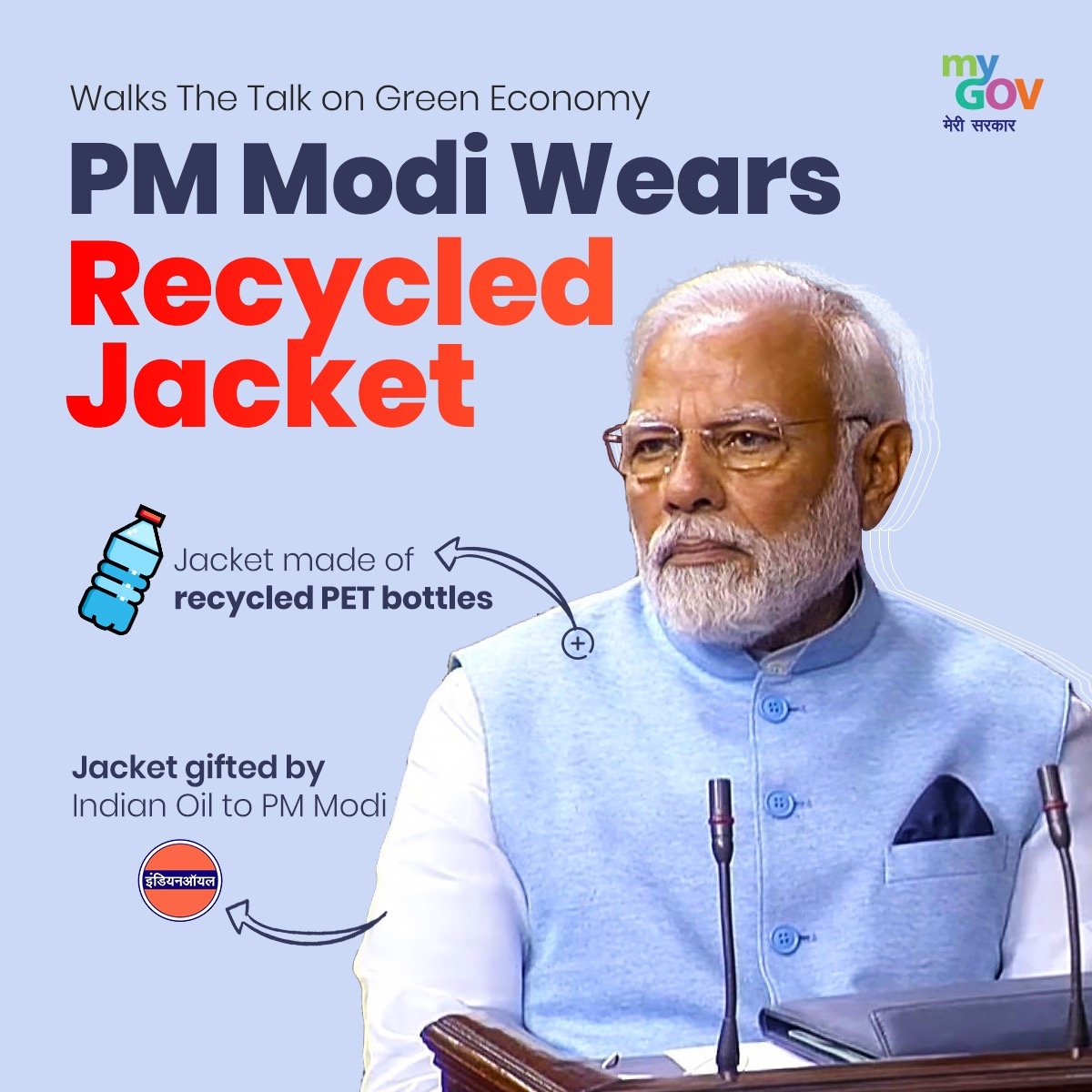 May be an image of 1 person and text that says "Walks The Talk on Green Economy PM Modi Wears Recycled Jacket my GOV मेरी सरकार Jacket made of recycled PET bottles Jacket gifted by Indian Oil to PM Modi"
