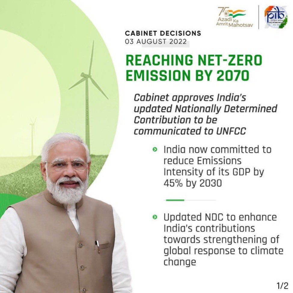 May be an image of 1 person and text that says "Azadi AmrtMahotsav CABINET DECISIONS 03 AUGUST 2022 p1b REACHING NET-ZERO EMISSION BY 2070 Cabinet approves India's updated Nationally Determined Contribution to be communicated to UNFCC စ India now committed to reduce Emissions Intensity of its GDP by 45% by 2030 Updated NDC to enhance India's contributions towards strengthening of global response to climate change 1/2"