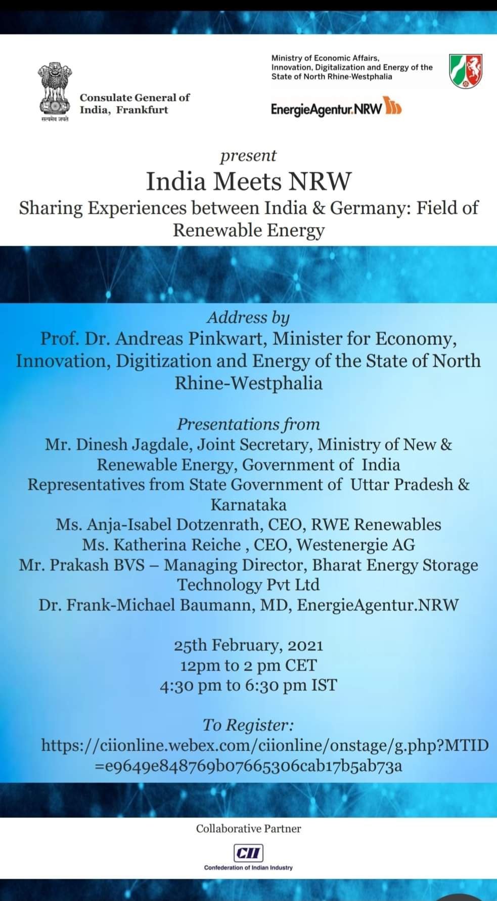 Consulate General of India Frankfurt, in collaboration with the Economic Affairs Ministry of the State of NRW is organizing the webinar: “Sharing Experiences between India & Germany: Field of Renewable Energy” under the banner of “ India meets NRW” EnergieAgentur.NRW and Confederation of Indian Industry (CII) are also our co-partners.