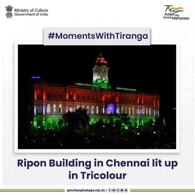 May be an image of text that says "Ministry of Culture Government o India Azdhotsav Mahotsav Amrit #MomentsWithTiranga Ripon Building in Chennai lit up in Tricolour amritmahotsav.nic.in f..OO"