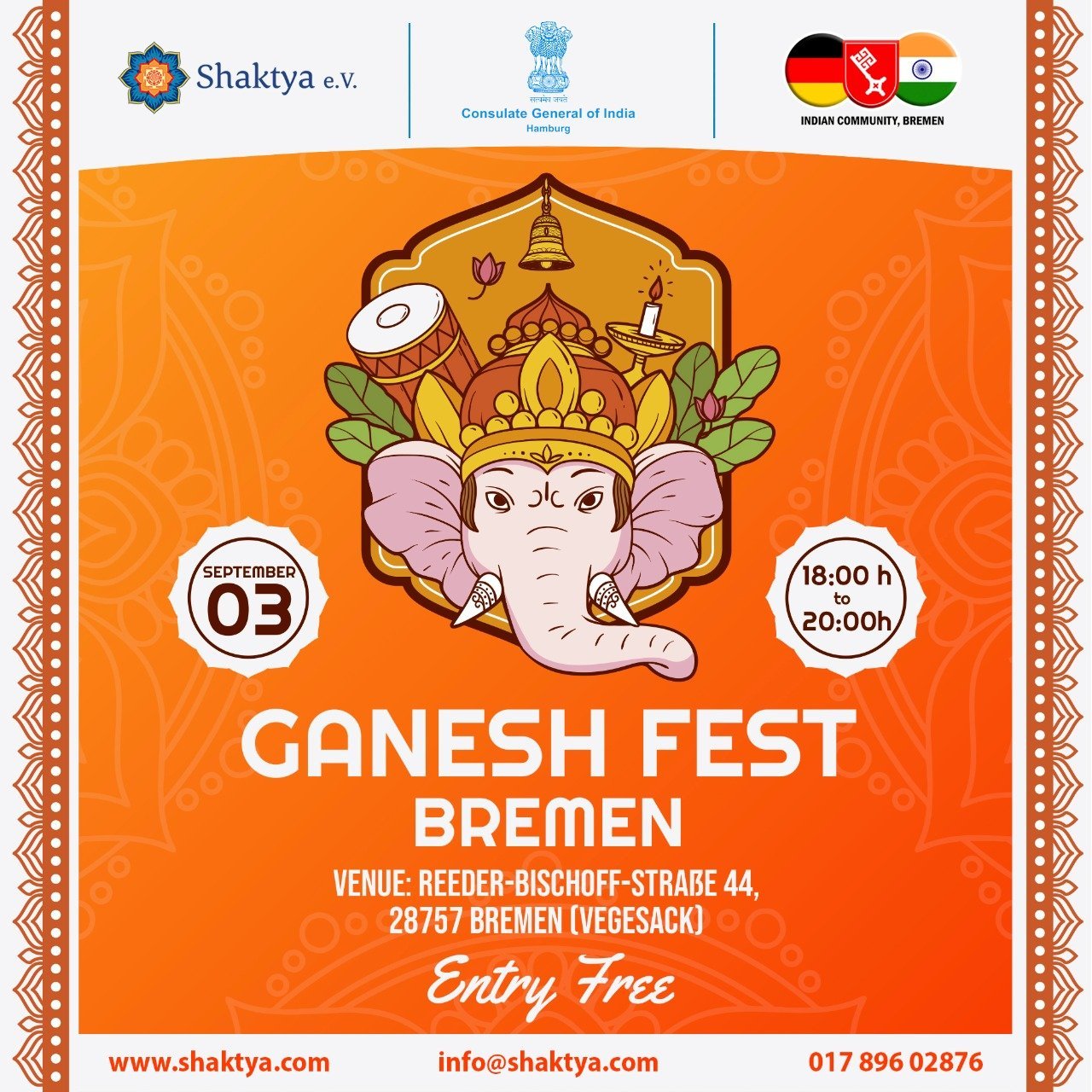 May be an image of text that says "Shaktya e.V. Consulate General Hamburg India INDIANCOMMUNITY,BREMEN BREMEN SEPTEMBER 03 18:00 20:00h GANESH FEST BREMEN VENUE: REEDER-BISCHOFF-STRABE44, REEDER BISCHOFF -STRABE 28757 BREMEN (VEGESACK) Entry Free info@shaktya.com www.shaktya.com 017 896 02876"