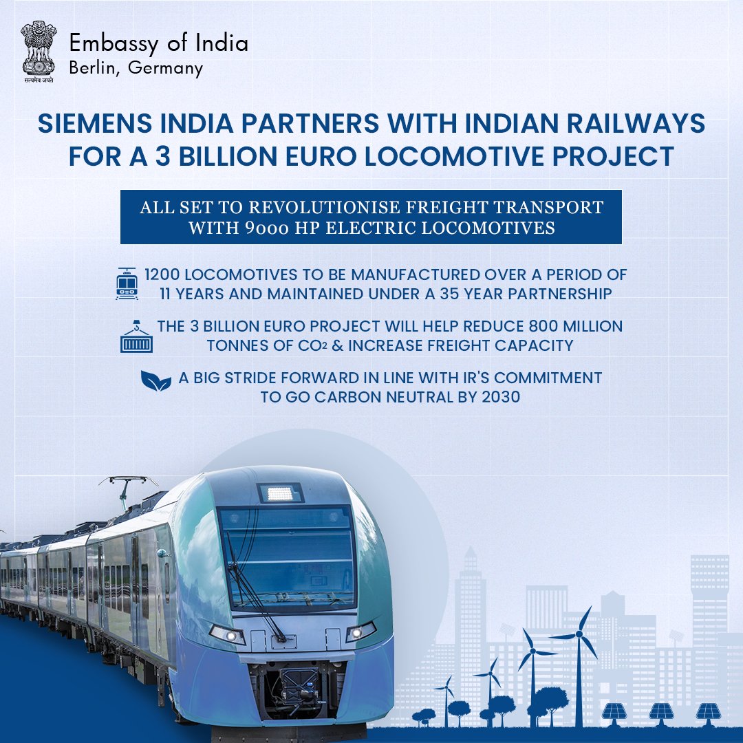 Siemens India has signed a contract worth 3 billion euros with Indian Railways(IR) to revolutionise freight transport with state-of-the-art 9000 HP electric locomotives.