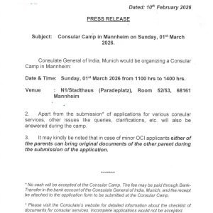 The Consulate General of India, Munich is organizing a Consular Camp in Mannheim to provide convenient services to the Indian community.