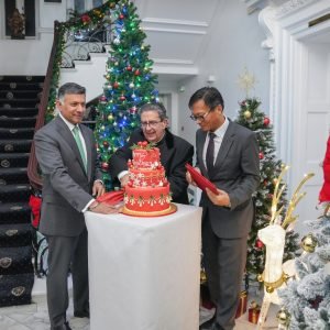 HC Vikram Doraiswami and H.E. Archbishop Miguel Maury Buendía, Apostolic Nuncio to the Court of St James’s, jointly switched on the Christmas lights and cut the celebratory cake, marking the start of the festive season.