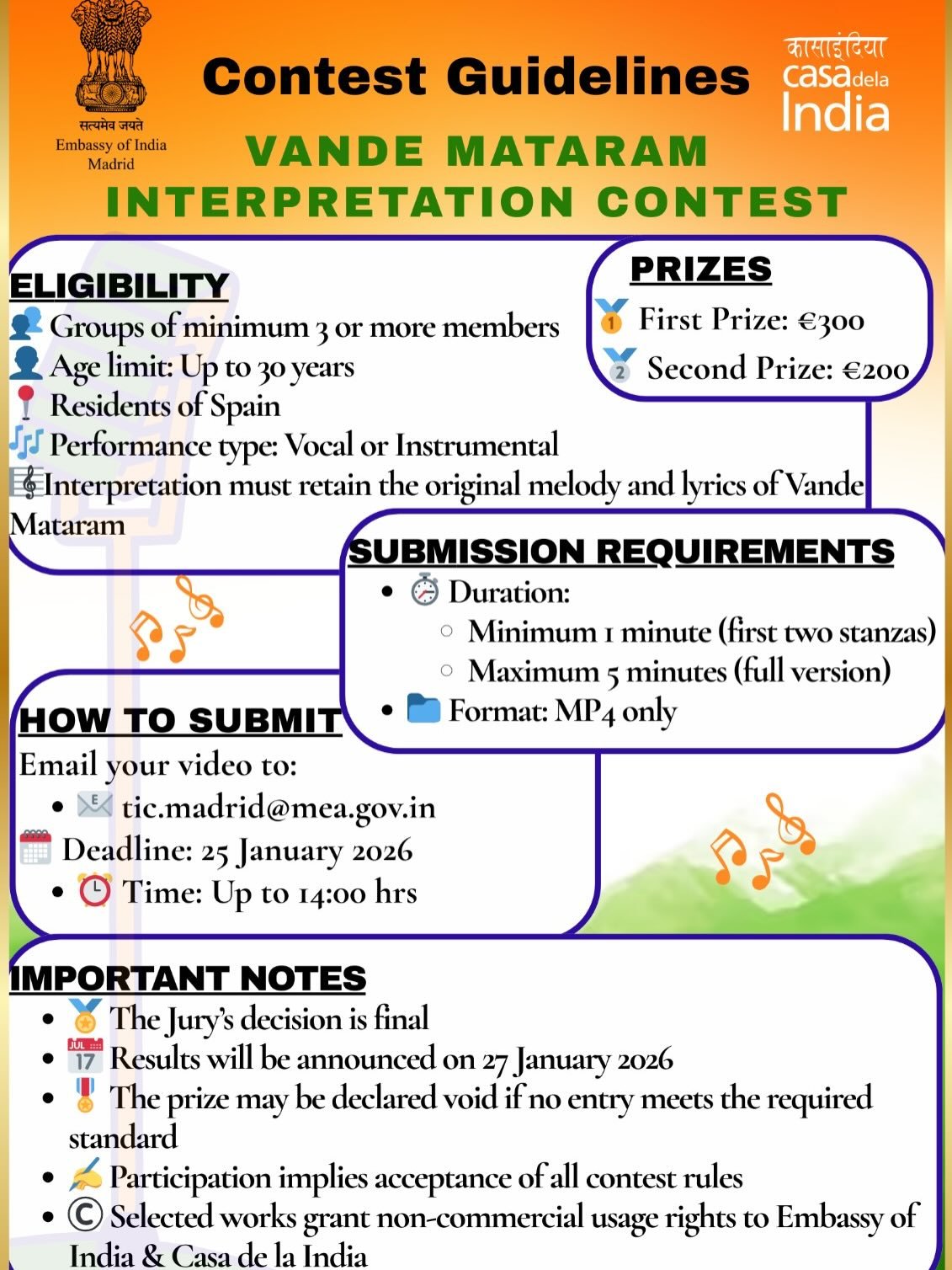 Honouring 150 years of Vande Mataram, the Embassy of India in Spain and Casa de la India invite young music groups across Spain to bring their own interpretation to this timeless song