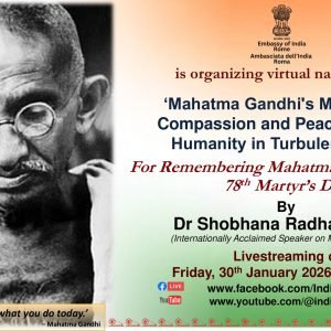 The Embassy of India cordially invites you to join a virtual commemorative meeting titled “Mahatma Gandhi’s Message of Compassion and Peace: Leading Humanity in Turbulent Times” to mark the 78th Anniversary of Mahatma Gandhi’s Martyrdom and to pay tribute to all the leaders who laid down their lives for the freedom of our nation.