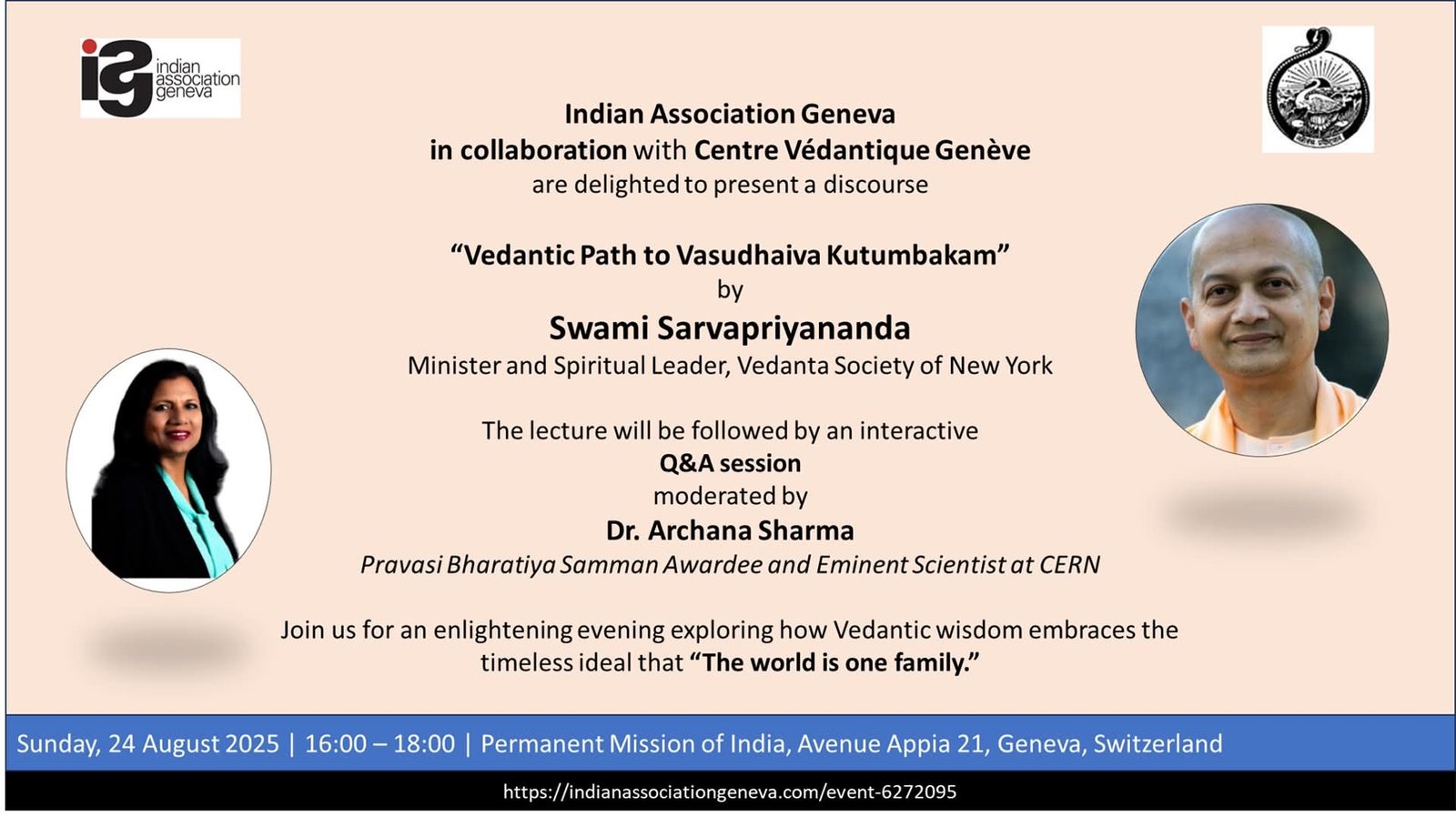 The Indian Association Geneva, in collaboration with the Centre Védantique Genève, cordially invites you to an inspiring discourse titled: