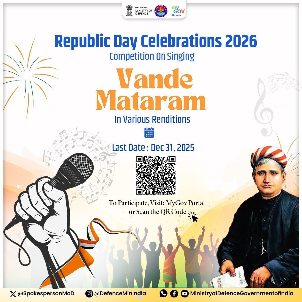 Ministry of Defence and MyGov India invite you to showcase your talent in the ‘Vande Mataram’ Singing Competition 2026.