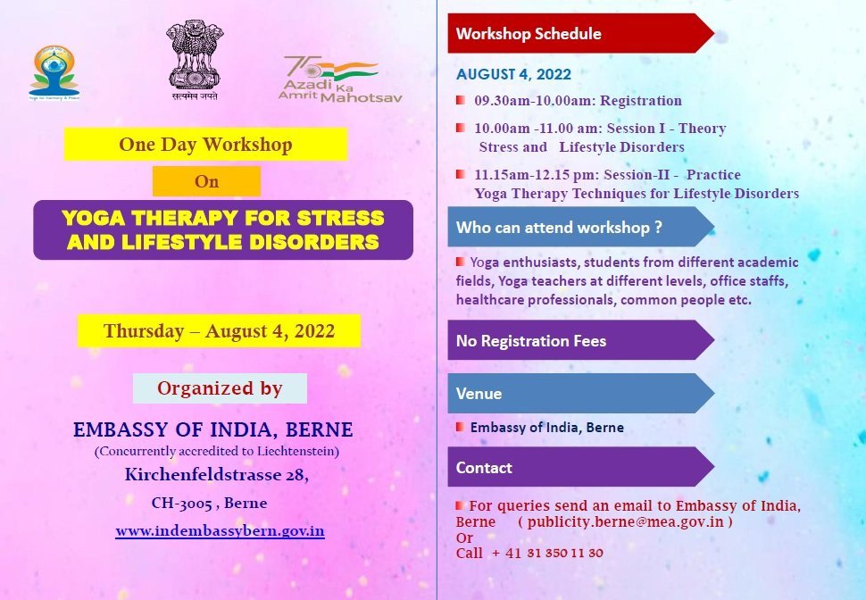 Join the one day Workshop on ‘Yoga Therapy for Stress and Lifestyle Disorders’ being organized by Embassy of India, Berne on 04 August, 2022.